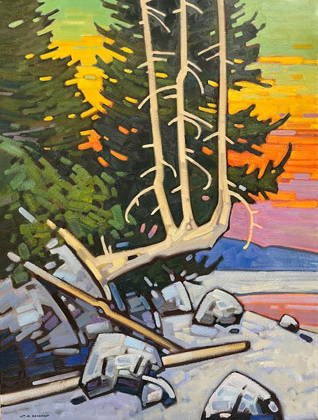 Cameron currently lives in the Cariboo of British Columbia with his wife and two young boys. He had a 400 sq. ft. studio built on their property allowing him to work with larger canvases in a relaxed environment. Having a woodstove in the studio helps to bring the camp life into his daily life. The surrounding views, animals and the changing of the seasons are important as well.