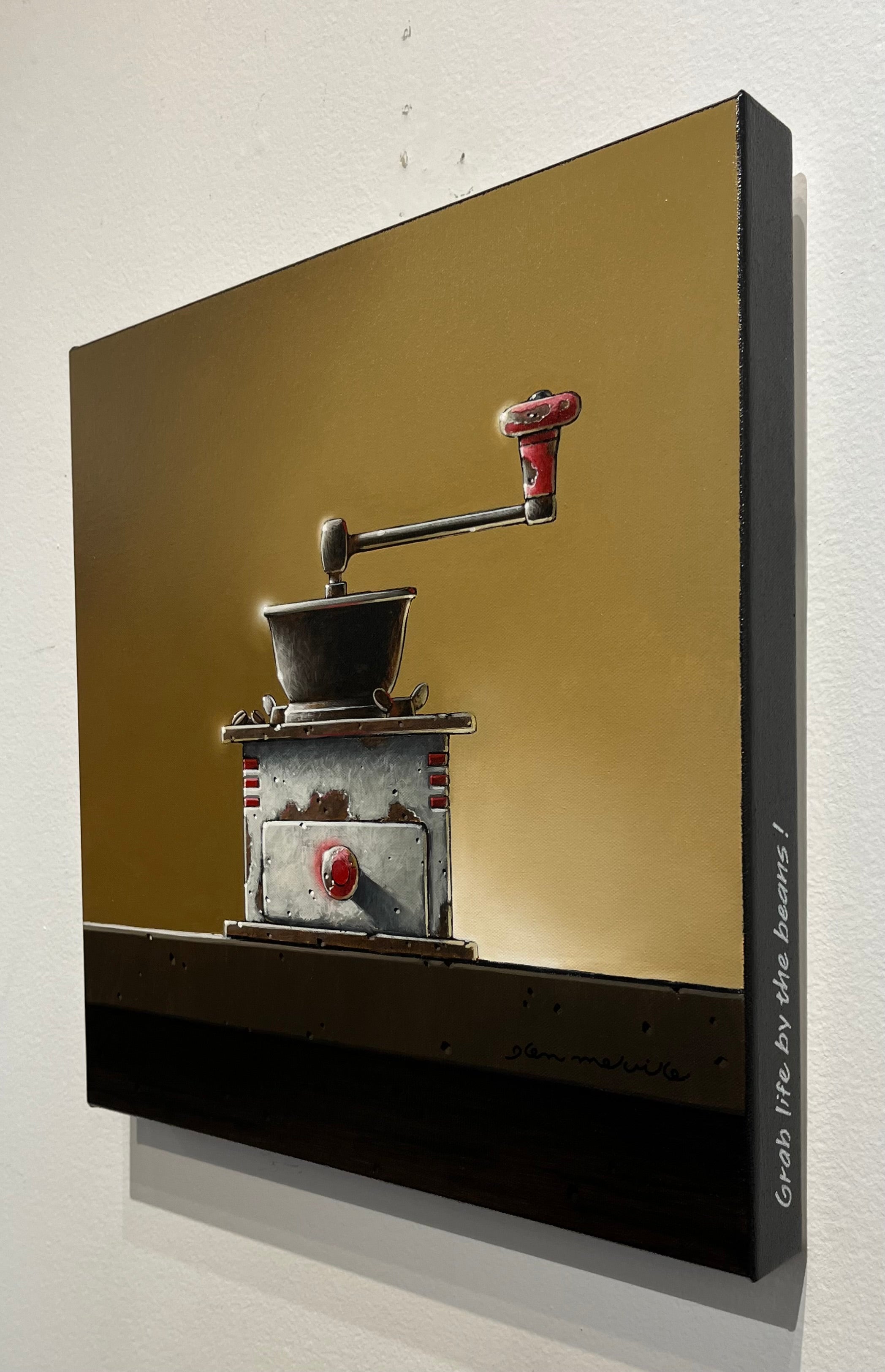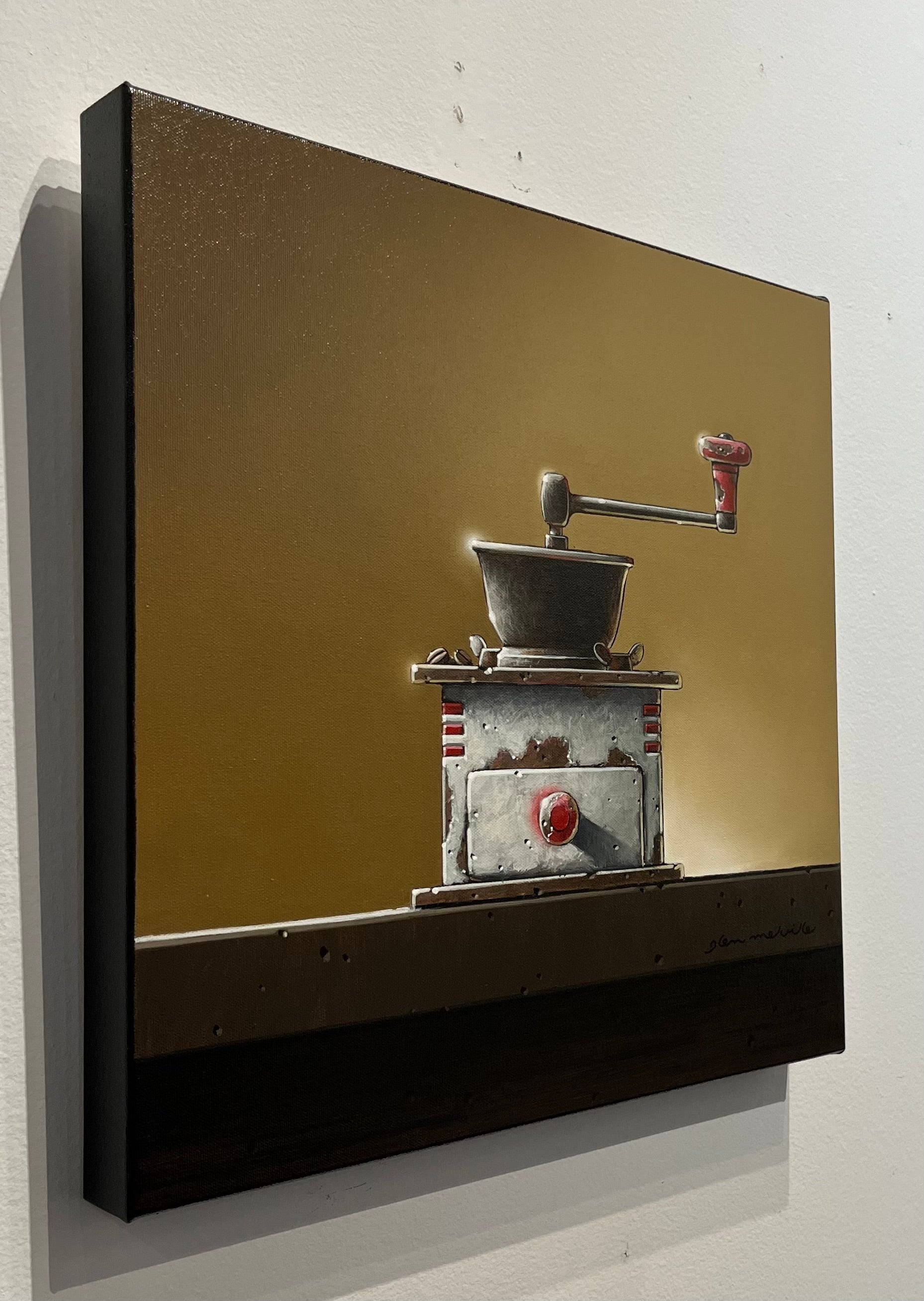 Alongside his eye studies, Melville has created a series of coffee grinder paintings, transforming ordinary objects into vibrant explorations of form, shadow, and texture. His use of acrylic and oil brings each piece to life, emphasizing the tactile and visual qualities of his subjects.
