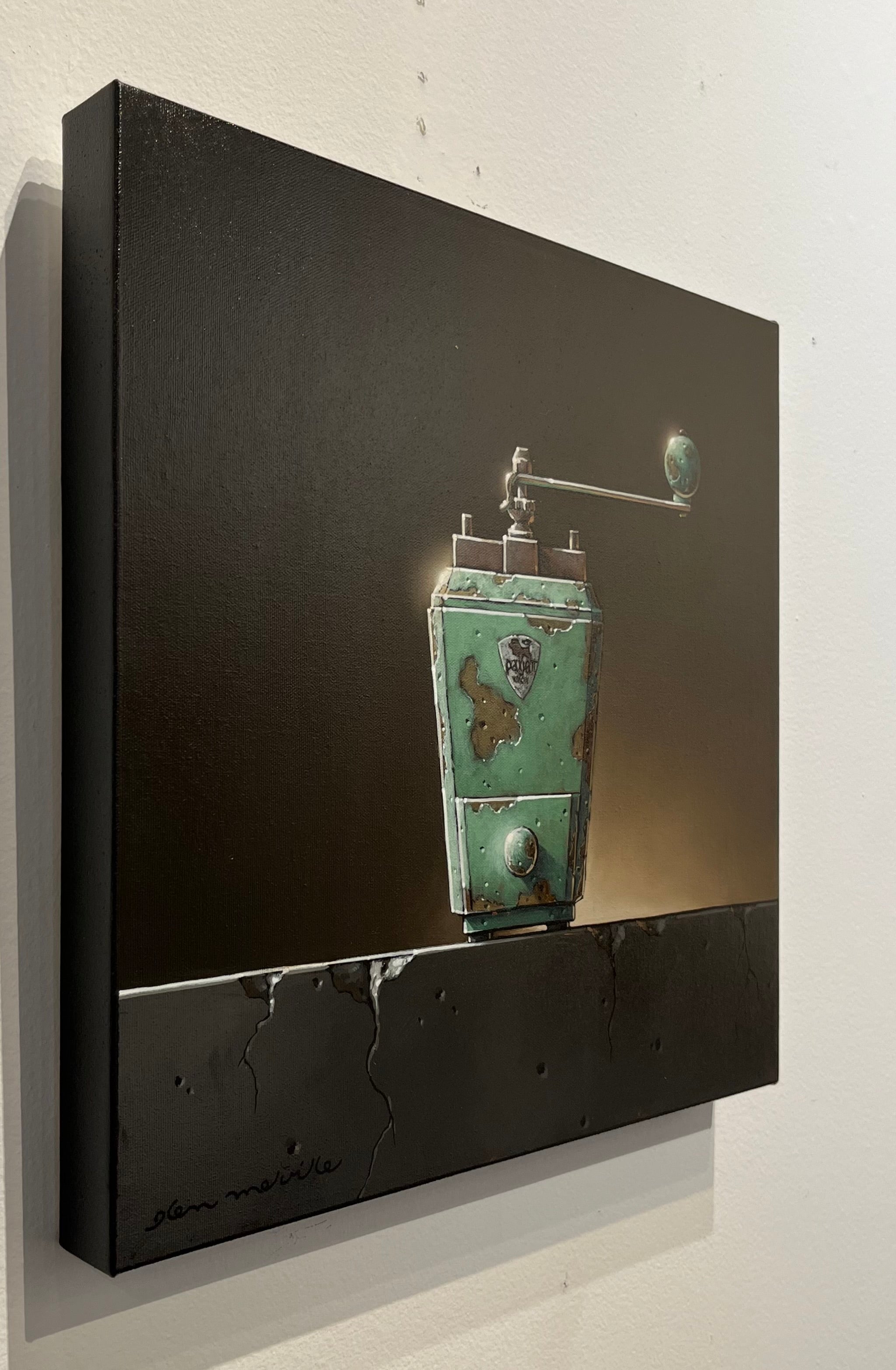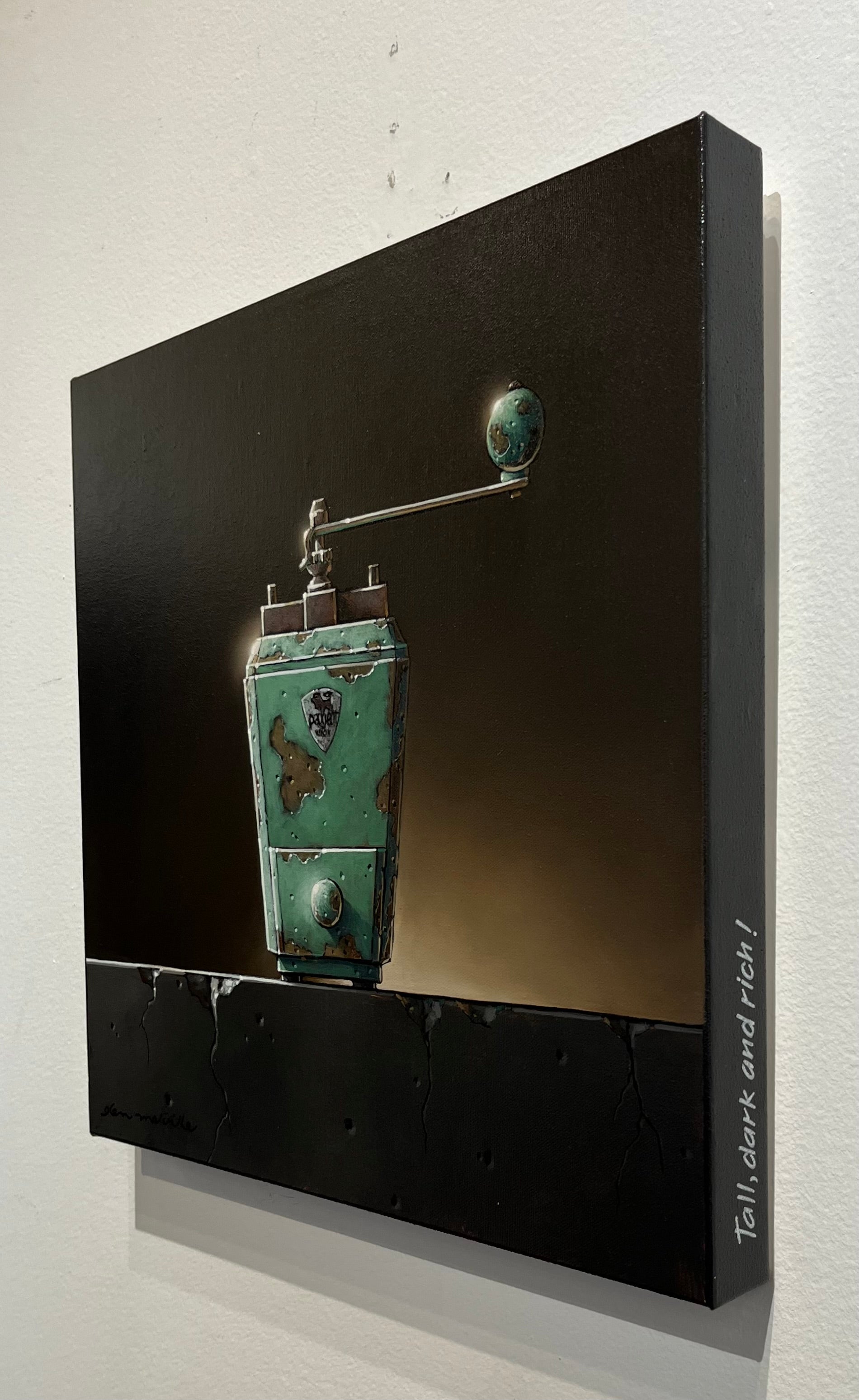 Alongside his eye studies, Melville has created a series of coffee grinder paintings, transforming ordinary objects into vibrant explorations of form, shadow, and texture. His use of acrylic and oil brings each piece to life, emphasizing the tactile and visual qualities of his subjects.
