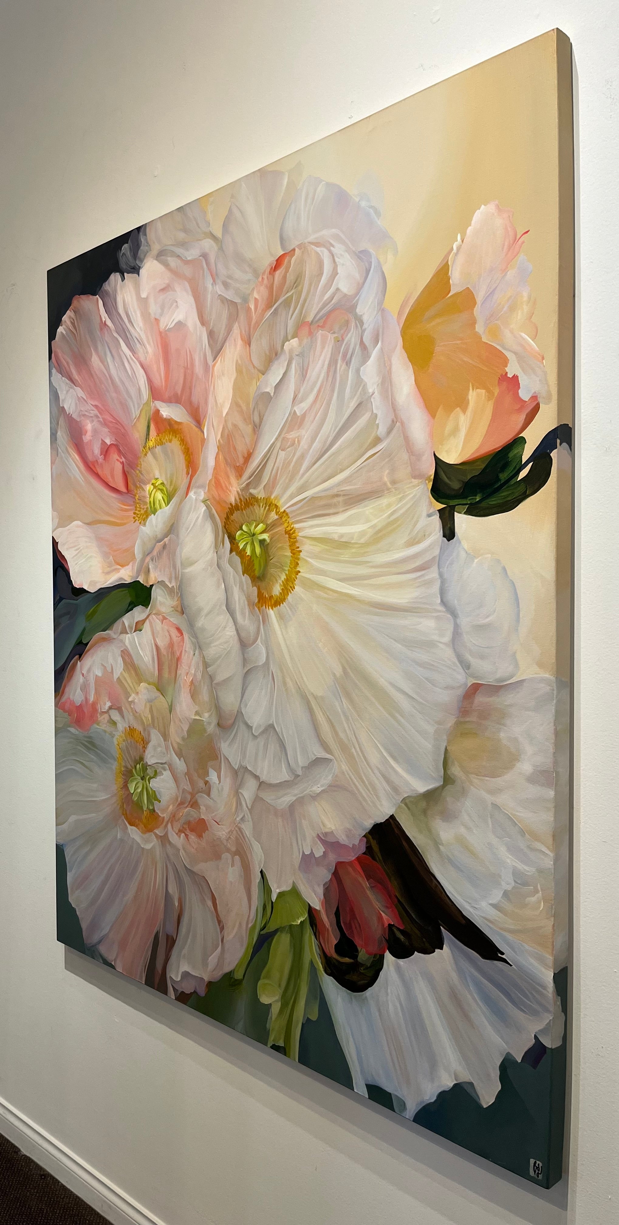 Her work appeals to collectors seeking modern floral art that stands apart from conventional flower paintings. These pieces bring softness and energy into a space at the same time, making them ideal for interiors that balance elegance with personality.