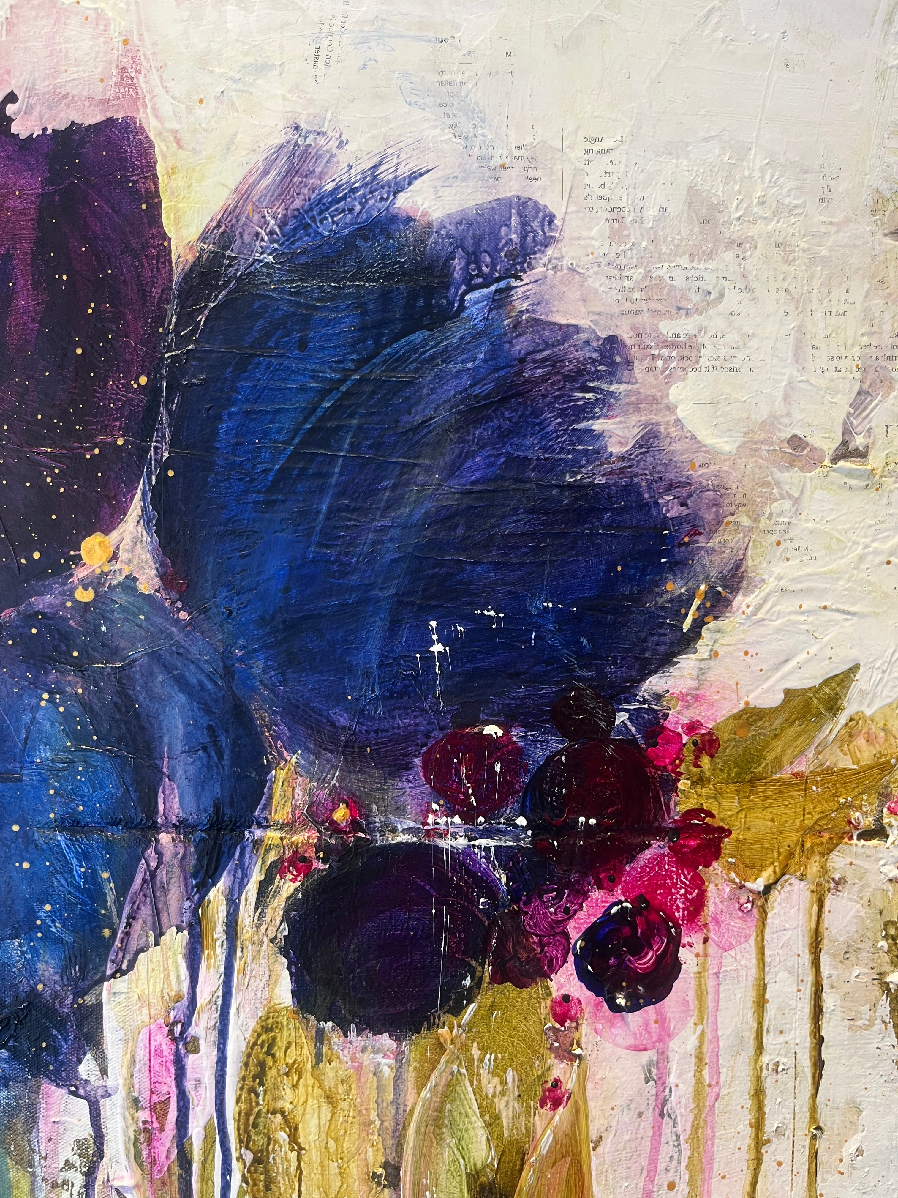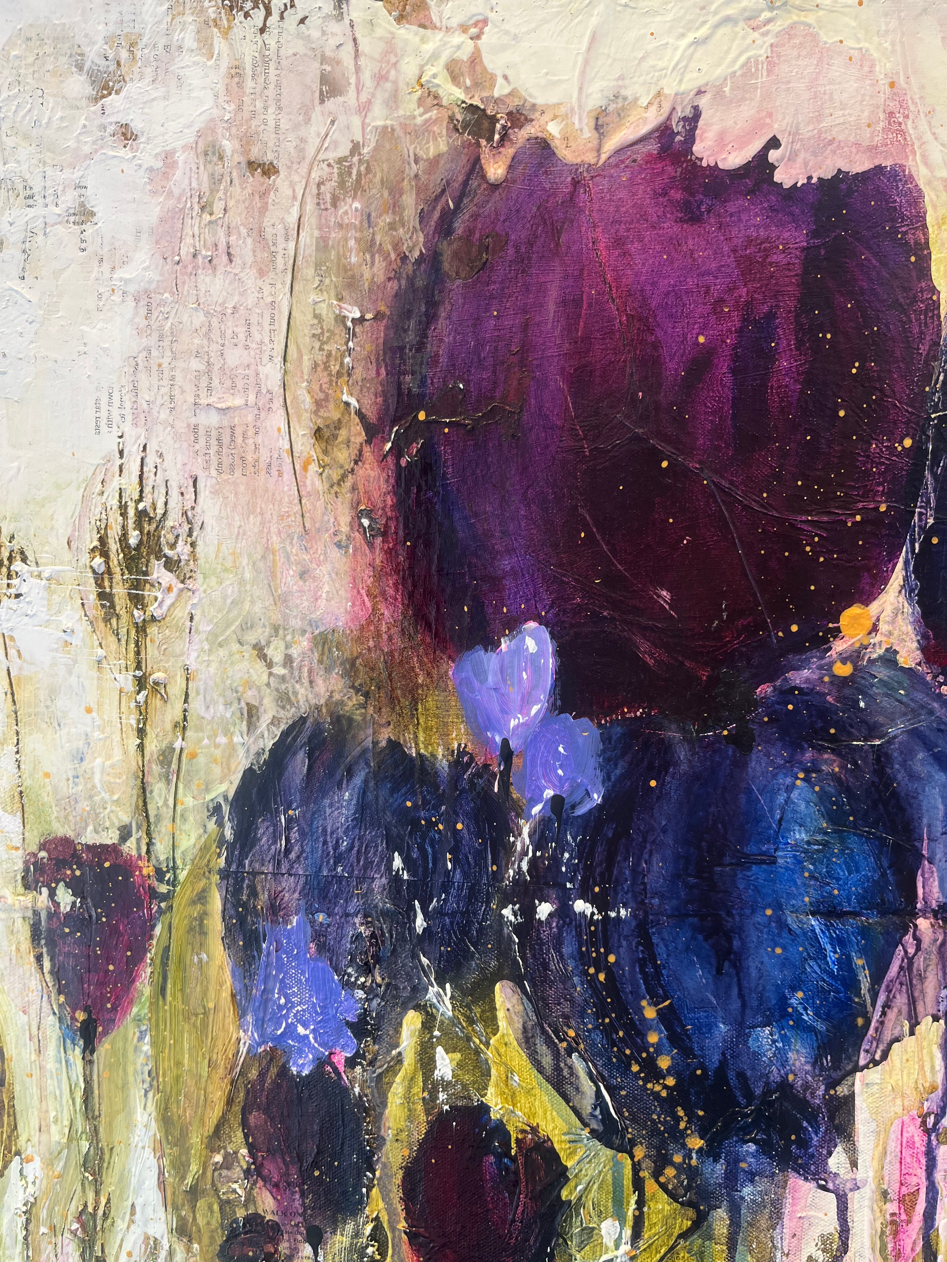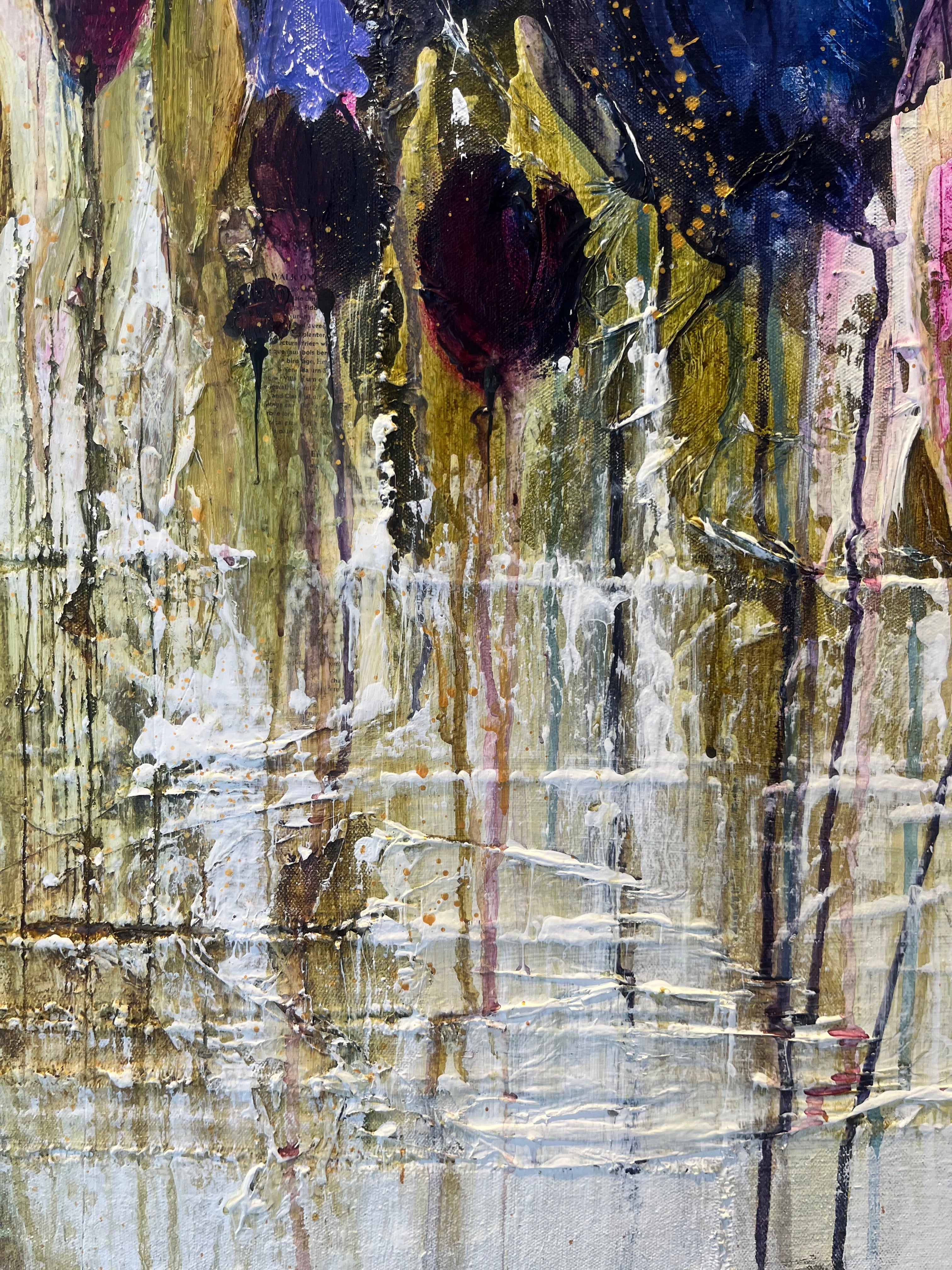 Described as beautifully imperfect, her paintings are rooted in emotion and imagination. In these recent works, blooms emerge and dissolve within fields of colour, creating a sense of movement, energy, and quiet intensity.